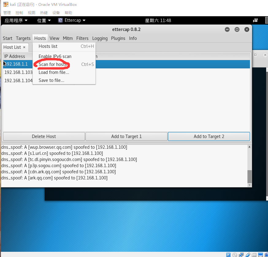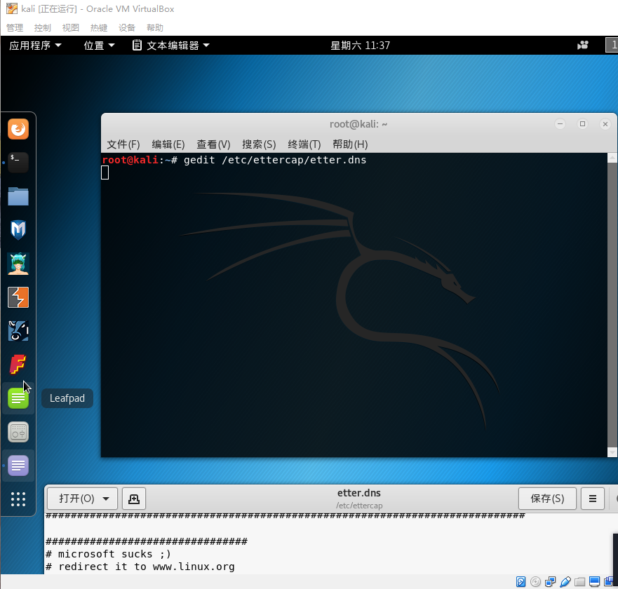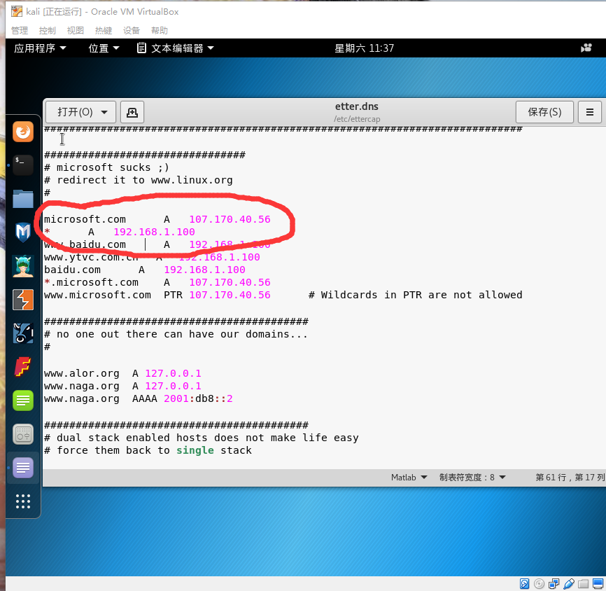 编辑etter.dns文件,(域名 A ip )表示要截获的域名并解析成的ip,*代表所有域名。