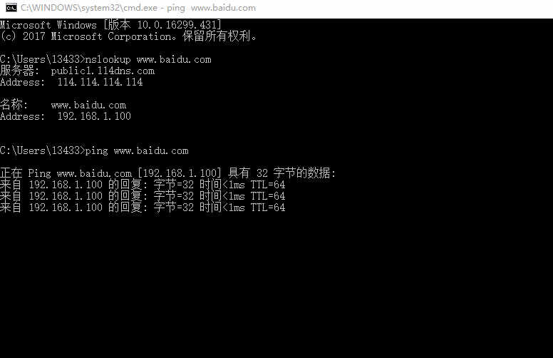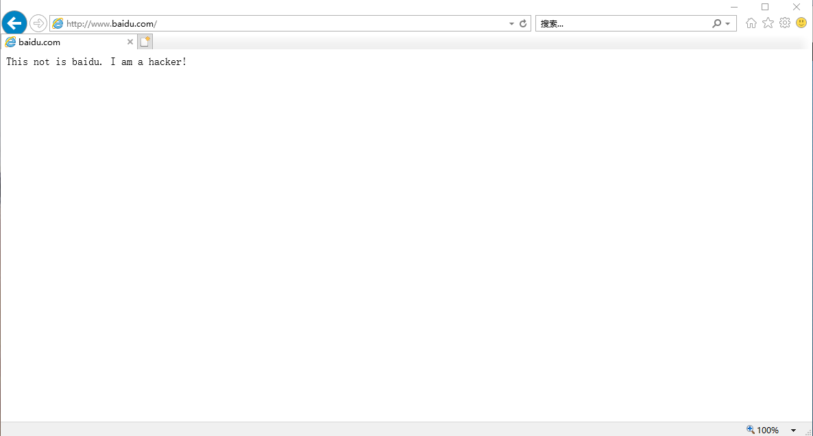 被攻击者请求解析百度的时候攻击者截获请求,并解析成自己的ip,并配置好自己的伪造的百度首页,被攻击者这样就打开的是你伪造的百度。当然,你不一定非要伪造百度,你可以弄个钓鱼网站或恶搞网站,你开心就好。