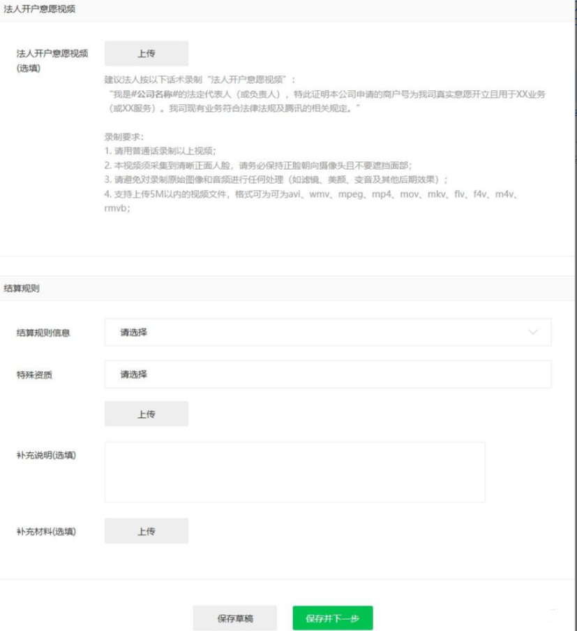 法人开户意愿这里是新加入的填写资料,应该是央行的要求,虽然是选填,但是填上可以提高通过率,结算规则按照实际情况填写即可,针对不同行业商户,微信结算费率会有所区别,有些需要特殊资质的行业,还要上传许可证