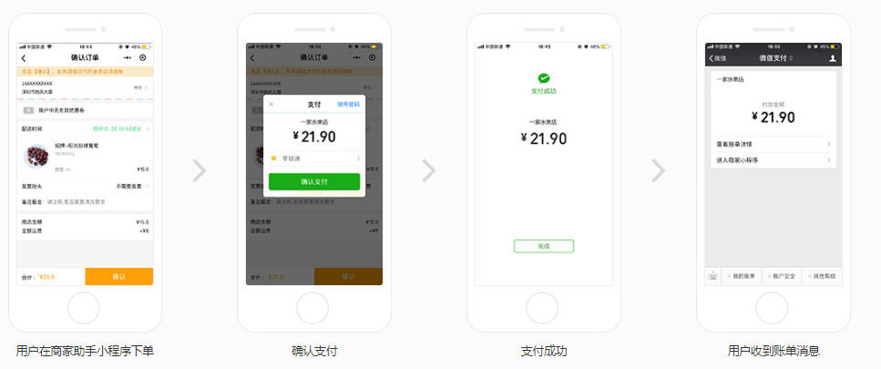 用户打开商家小程序下单,输入支付密码并完成支付后,返回商家小程序,随后通过微信支付公众号下发账单消息