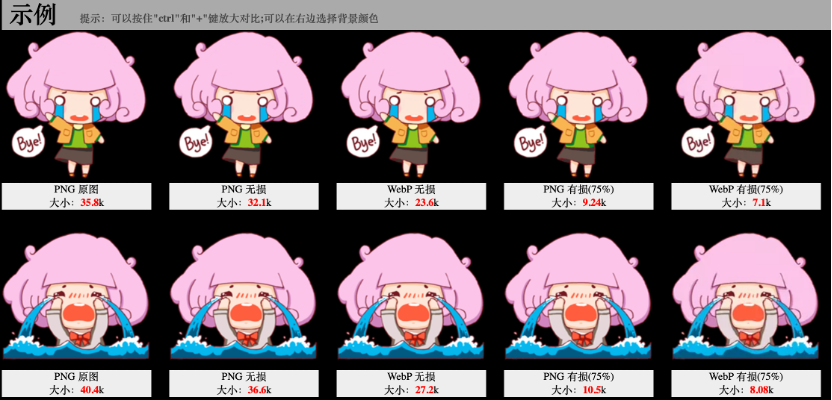 关于图片的压缩,目前压缩比较高的是 Google 推出的 WebP 格式,它与常见的 Png 格式图片的压缩比例对比如下图: