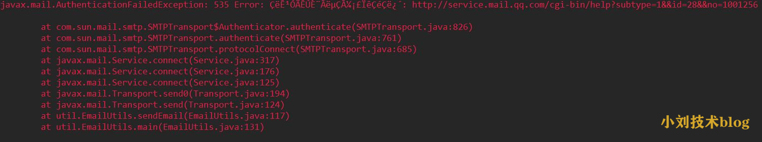 关于上述方案,适用于一般的邮箱申请(腾讯企业邮箱、网易邮箱),但不适用于qq邮箱,原因是qq邮箱目前只接受授权码方案登录,官方的解释是“温馨提示:在第三方登录QQ邮箱,可能存在邮件泄露风险,甚至危害Apple ID安全,建议使用QQ邮箱手机版登录。 继续获取授权码登录第三方客户端邮箱 。” 使用上述方法登录qq邮箱会遇到报错 javax.mail.AuthenticationFailedException: 535 Error: ÇëʹÓÃÊÚȨÂëµÇ¼¡£ÏêÇéÇë¿´: http://service.mail.qq.com/cgi-bin/help?subtype=1&&id=28&&no=1001256