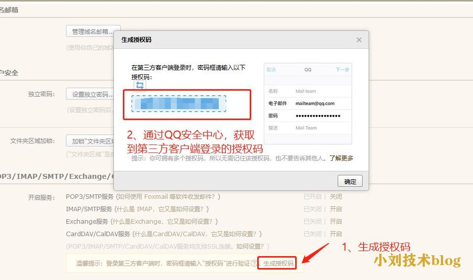 获取方式 [登录邮箱] – [设置] – [账户] ,然后如下图找到POP3/SMTP服务的下面,有一句温馨提示 先点 [生成授权码] ,再根据提示获取到授权码。